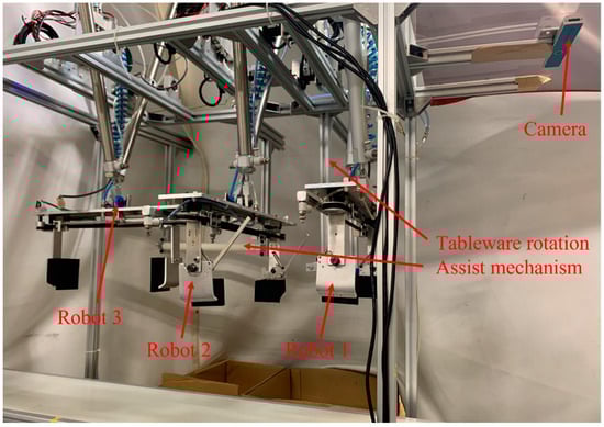An experiment was conducted to determine if the robot could obtain the tableware information and tidy up the tableware. The conveyor moved at a speed of 15 mm/s, the air pressure was set at 0.3 MPa, and the tableware was randomly placed on the tray and passed to the robot by the conveyor. The higher tableware was tidied up. The cup was tidied up by robot 1, the bowl was tidied up by robot 2, and the plate was tidied up by robot 3.