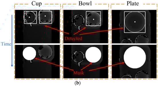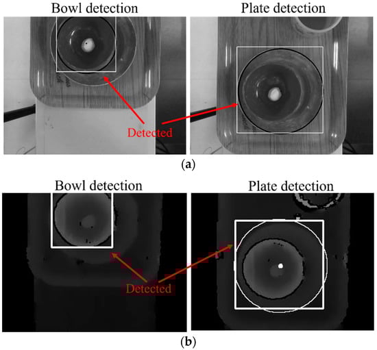 Experiments were conducted to verify the method of image detection. Three tableware samples were randomly placed on the tray flowing into the camera range on a conveyor at a speed of 15 mm/s. In order to detect tableware, the radius setting range of the Hough transform was plate: 77–88 mm, bowl: 48–67 mm, and cup: 42–50 mm in the gray image; plates: 75–93 mm, bowls: 50–68 mm, and cups: 37–62 mm in the depth image. The status of the image detection is shown in Figure 10, and the frame is the detected position of the tableware. Note that only the plate was detected in plate image detection. The detected position was not deviated, the same with the plate detection, and only the bowl was detected in the bowl image detection. However, in the cup depth image detection, a bowl was recognized as a cup due to erroneous detection of the depth image in this experiment. By determining whether the coordinates were the same as the position of the cup in the gray image, the erroneous inspection was eliminated. The whole process took 0.5 s.