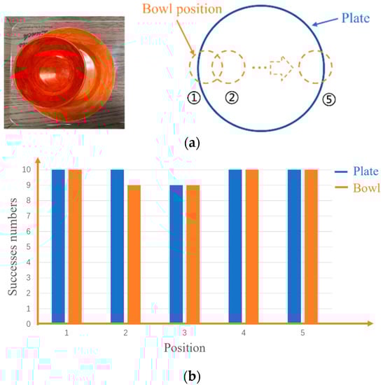 Detection of tableware overlap at different positions: (a) overlap of bowl and plate at different positions; (b) success rate of the overlap at different position.