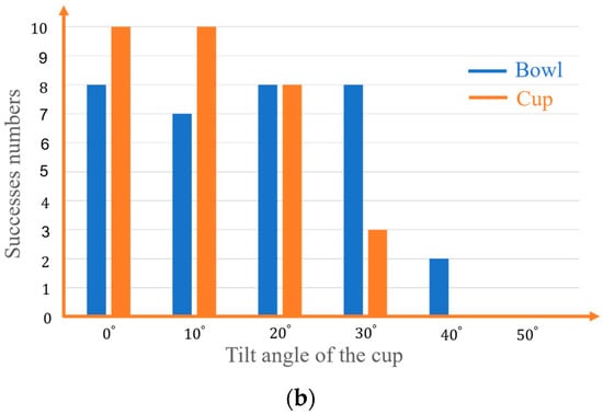 Detection of the tilt angle and success rate of the cup and the bowl overlap: (a) bowl and cup overlap; (b) success rate of tilt angles.
