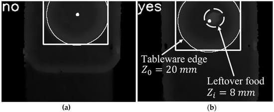 As shown in Figure 14, when there was no leftover food on the plate, a mark of no appeared in the upper left part of the image. When there was leftover food on the plate, it was detected that the tableware edge height was and the leftover food height was . Because , leftover food was judged, and a mark of yes appeared in the upper left part of the image. It was validated that this method of determining leftover food was effective.