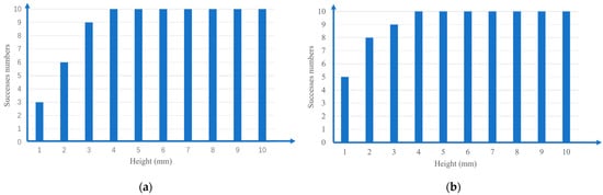 In the leftover food detection experiment with the bowl and plate, the leftover food was placed on the plate and bowl at 1 mm intervals, using a height from 1 mm to 10 mm. Experiments were conducted 10 times each, and the results are summarized in Figure 15. The reason for the failure was an error of about 3 mm in the distance inspection, and when the height of the residual food size was less than 4 mm, there was an error in the judgment of the residual food due to the error of the distance inspection. A leftover food size less than 5 mm was not recognized as leftover food, and it could be washed with a dishwashing machine, so it was not processed. A leftover food size bigger than 5 mm being detected was the target in this study, and it could be appropriately detected.