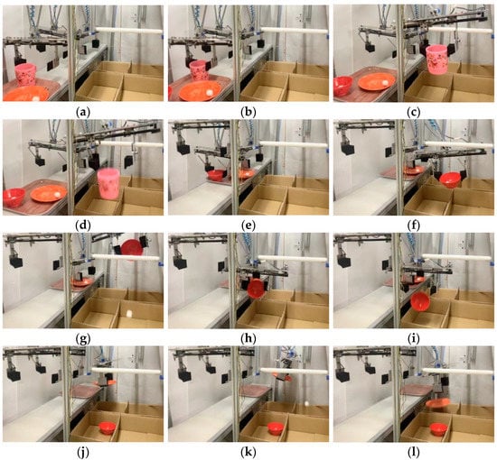Each tableware item and leftover food were detected, as shown in (a) to (l) of Figure 16. Each corresponding robot hand went to the standby position, and the finger opened 40 mm larger than the tableware diameter. The fingers closed and grabbed the tableware at the moment when the cup reached robot 1’s hand. Since there was no leftover food in the cup, the fingers opened and dropped the cup into the cup collection box. At the moment when the bowl reached robot 2’s hand, the finger closed and grabbed the bowl. Since the leftover food in the bowl was also detected, the hand and the tableware were tilted by the rotation assist mechanism, and the leftover food was thrown away. After that, it was moved to the collection box of the bowl, and the bowl was dropped into the collection box. Similarly, when the plate reached robot 3’s hand, the fingers closed and grabbed the tableware. Since there was leftover food on the plate, the rotation part of the finger and plate was tilted with the rotation assist mechanism, and the leftover food was thrown away; then, the plate was dropped into the plate collection box. It took 57 s from the moment the first tableware was grabbed to when the last tableware was tidied up.