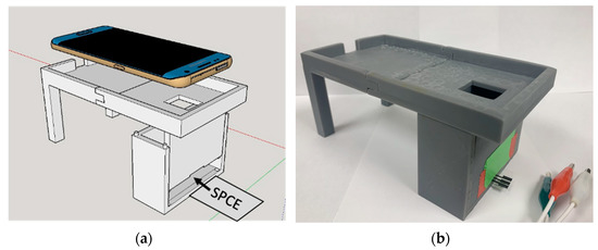 SketchUp 2017 design (a) and photograph (b) of the light-tight housing and phone holder. The optical detector rests in the tray and uses the small window to image the light-tight chamber. The SPCE is inserted into the closed chamber through a narrow slit as shown. The design is modular and the phone holder can be swapped out with the CCD camera holder (not shown).