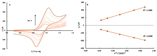 Cyclic voltammograms (A) and peak current versus the square root of scan rate (B) for a solution containing 5.0 mM Ru(bpy)32+ in 0.10 M PBS (pH 7.4). Scan rates investigated were 0.05, 0.10, 0.25, 0.50, and 0.75 V/s.