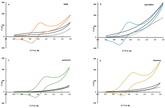 As previously mentioned, toxicity levels for various BA have been proposed and can vary depending on the amine and the type of food product. Histamine receives the most attention from groups such as the European Food Safety Authority (EFSA), Food and Drug Administration, Food Safety Commission of Japan (FSCJ), and the World Health Organization (WHO). However, other BA can cause illness on their own or enhance histamine’s toxicity. Depending on the study or food product, measurements may need to be made on maximum tolerable limits of specific BA [2,3,10,12,15] or total BA [2,5,12]. The electrodes reported here would be able to measure a total amine content or, when coupled to a separation method, measure the concentration of individual BA.