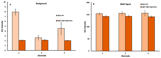 ECL signal collected with a mobile phone detector under an applied potential of 1.1 V for three different electrodes using solutions containing 5.0 mM Ru(bpy)32+ plus (A) 0.00 mM and (B) 0.45 mM DBAE with trials captured either in open air or using the light-tight housing in Figure 1 (n = 10 at each electrode).