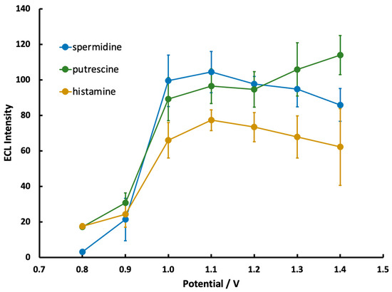 Based on the above constraints, applied potentials of 1.0–1.2 V were identified as areas of optimal ECL production for spermidine and putrescine, while a region of 1.1–1.2 V was identified for histamine. A potential within the above ranges was selected for subsequent trials of each amine.