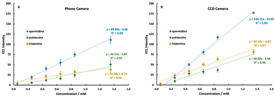 To assess the quality of a mobile phone camera as an optical detector for ECL in biogenic amines, identical calibration curves were prepared for each amine solution and measured with both detectors (Figure 6). Based on the results of the potential optimization study, a potential of 1.10 V was used for spermidine and putrescine, while a potential of 1.2 V was used for histamine. Solutions containing spermidine were prepared initially in a pH 7.40 0.10 M phosphate-buffered solution, since previous studies [25,28] had demonstrated good ECL production by spermidine around pH 7.0. However, tests conducted after the calibration curve experiments showed little difference in spermidine ECL production in a pH 9.00 solution. Our recommendation would be to prepare all solutions in a pH 9.00 buffer for simplicity.