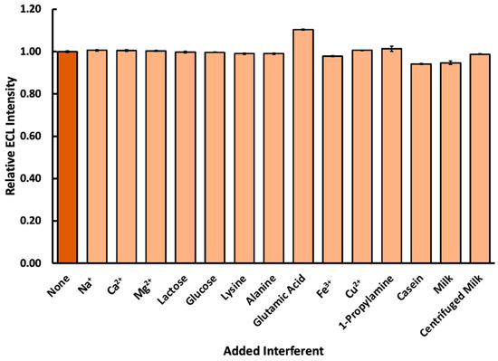 Real food samples present complex matrices in which a number of possible chemical interferences may exist. Before the Ru(bpy)32+ ECL reaction system could be measured in a real-world sample, it was necessary to confirm that a representative selection of common biological molecules and ions would not interfere in ECL production from biogenic amines. Figure 7 shows a comparison of a 1.0 mM spermidine and 5.0 mM Ru(bpy)32+ ECL reaction at 1.10 V with the presence or absence of 1 mM interferents that could be found in a dairy sample such as milk.