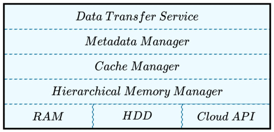 In the literature, there are few solutions with hierarchical storage management of data, including the memory, the filesystem, and the cloud, similar to that implemented in the data containers proposed in this paper. These tools are Alluxio, IRIS, and Hermes. To manage the caching through this hierarchy, these solutions apply two policies: last frequently used (LFU) [50] and last recently used (LRU) [51]. In LFU, the most accessed data are moved to the top of the hierarchy, whereas in LRU, the newest data are moved.