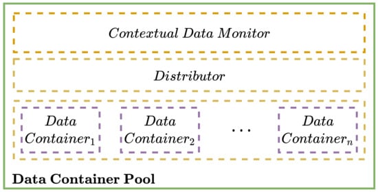 Figure 2 shows the stack representation of a pool of temporal storage services created by using a pool of data containers. This is composed of a contextual data monitor, a distributor, and the data containers.