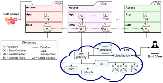 In a differed manner, the data stored in a data container pool are sent to the cloud by using a CDN based on catalog abstractions, which are basically virtual storage spaces in multi-cloud environments. Moreover, this CDN interconnects data containers deployed in any of the edge, the fog, or the cloud, enabling the exchange of data and creating continuous edge–fog–cloud dataflows.