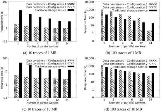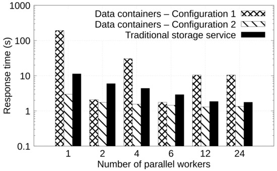 In addition, in Figure 5a–d, it can be observed that the Configuration 2 of the data containers yields a lower response time than the traditional storage service solution. For example, the traditional storage service solution spent 777.52 s to exchange 100 ECG files of 10 MB with one worker (see Figure 5d), whereas the data container solution spent 41.40 s. This is an acceleration of 18.77X and a percentage of performance gain of 94.67%.