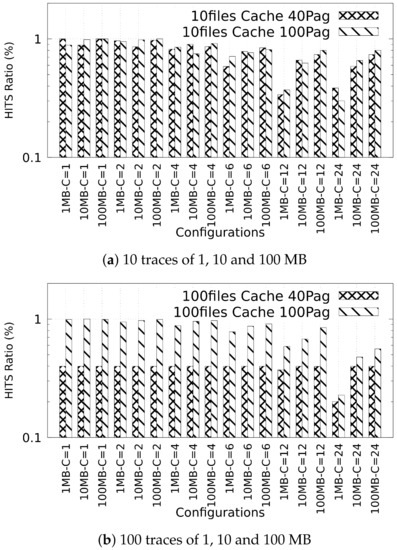 Figure 6a,b show, in the vertical axis, the hit ratio to 10 and 100 allocated and located files of 1, 10 and 100 MB when two different cache sizes (40 and 100 pages) are used, as well as by using different configurations of concurrency (C) (see horizontal axis in Figure 6a,b).