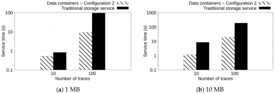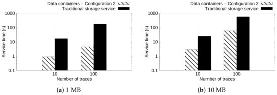 Figure 8 shows in the vertical axis the service time observed when uploading 10 and 100 traces (horizontal axis) of 1 and 10 MB (see Figure 8a and Figure 8b, respectively). Similar behavior was observed in Figure 8 when downloading contents. Again, Data containers—Configuration 2 yields a lower service time than the traditional storage service solution. For example, in Figure 8b, it can be observed that Data containers—Configuration 2 downloaded 100 ECG files of 10 MB in 8.44 s, whereas the traditional storage service downloads the same workload in 185.40 s. This represents that the data containers configuration yields a performance gain of 95.44% in comparison with the traditional storage service.