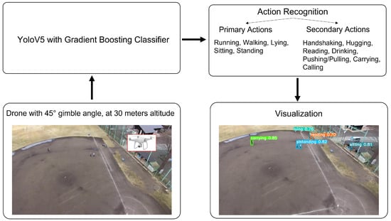 Overview of pipeline of work. First, the flying drone with a camera captures the images of the scene, which are input into the YoloV5 detector in an offline process. The gradient boosting classifier makes weight adjustments for difficult samples and re-trains the model for final action detection.