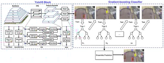 The left side of this figure explains the anchor-box free single-stage YoloV5 detector. YoloV5 architecture comprises of backbone architecture, neck layer as feature pyramid network (FPN), and prediction heads as bottleneck layers. The right side of this figure illustrates gradient boosting, which ensembles the predictions of the Yolo classifier for final action detection.