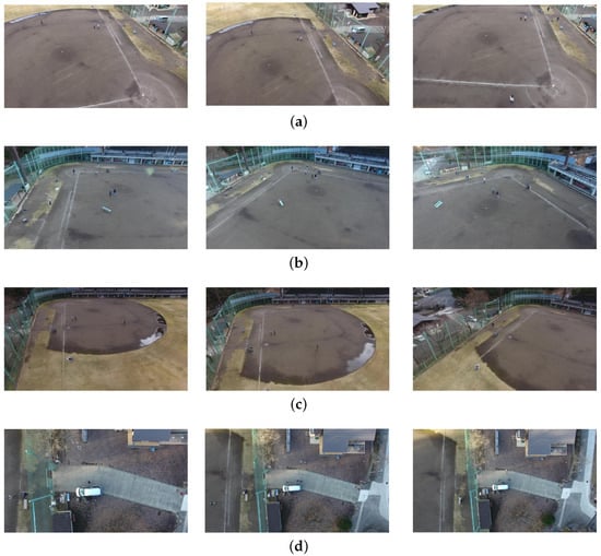 The Okutama-Action dataset [42] consists of a 43-minute-long annotated video sequence of 12 different outdoor action categories with about 77,000 image frames. This is a challenging dataset because it includes abrupt camera motion, dynamic transition of actions, scale variation due to near–far movement of drone, and variation in aspect ratio of actor while performing different actions. Some example images of the Okutama-Action dataset are shown in Figure 4. Okutama-Action videos were captured using a DJI Phantom 4 UAV at a baseball field in Okutama, Japan. These twelve actions of the Okutama-Action dataset are grouped into three types:
