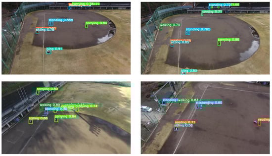 We present a comparison of our proposed method with other state-of-the-art methods in Table 4. Barekatain et al. [42] used SSD for detecting actions in Okutama-Action dataset with image size of 512 × 512. The authors ran their experiments on RGB and optical flow streams and then combined the results of both streams for better accuracy. During experimentation, it was realized that the SSD model performed best when the camera angle was 45 degrees. It was also noticed that strongly related temporal actions, e.g., the running action, resulted in lower recognition accuracy because SSD sequentially performed detection in a frame-by-frame manner. Soleimani et al. [69] proposed a two-stage architecture for identifying the action categories in the Okutama-Action dataset. The first stage relies on SSD for finding objects of interest, whereas the second stage uses another CNN to learn the latent sub-space for associating aerial imagery and action labels. The main difference between SSD and Yolo architectures lies in the handling of bounding boxes, as SSD treats each bounding box prediction as a regression problem. Yolo architecture, on the other hand, computes non-maximum suppression and thus retains the final bounding box. Yolo methods are slightly better than SSD in detecting smaller objects. This is exactly the situation in our scenario due to the distance between flying drones and human subjects on the ground. This proposed architecture resulted in significant increase of 28.3% in mAP for 50% IoU. Geraldes et al. [39] devised POINet (Position and Orientation Invariant Neural Networks) by employing MobilenetV2 [70] and reported the action detection performance separately for primary and secondary actions. The performance of our proposed method in terms of primary and secondary actions is also better than [39]. In Table 4, we explicitly mentioned the type of classifier for each methodology and realized that the gradient boosting classifier with Yolo action detector shows better performance than the fully-connected feed-forward classifier with detectors. The qualitative detection results of our proposed methodology are presented in Figure 5.
