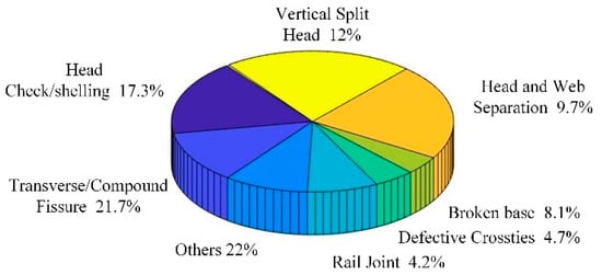 Railways are an important part of our infrastructure and play a key role in the overall transportation system. As rails carry trains, their safety plays a vital role in the safe operation of these vehicles. The actual operating environment of rails is complex, and the risk of rail fracture increases due to long-term high loads. Rail fracture is caused by many reasons, including rail bottom transverse cracks, bolt holes, weld failure, internal defects, and so on. According to the report published by the Office of the Federal Railroad Administration on railway accidents in the United States from 2005 to 2014, transverse cracks caused the biggest amount of railway accidents—21.7% of the 2653 accidents were due to transverse cracks [1,2,3]. The causes of accidents resulting from various types of rail damage and their proportion distribution are shown in Figure 1. A rail is structurally divided into three areas: rail head, rail web and rail bottom. Compared with the rail head and rail web, the rail bottom area is a detection blind area for existing rail damage detection-technology due to the particularities of the rail structure and installation. However, damage to the bottom of the rail is very harmful to the health of the rail structure, and it can easily cause the rail to break if it is not discovered and repaired in time. Figure 2 shows the causes and proportions of rail route breaks in the UK rail network for 2010–2011 and 2013–2014 [1,4,5]. From the above data, it can be seen that rail bottom defects are the main cause of rail fractures, attributed to 39% and 55% of all fractures that occurred in the two statistical intervals of 2010–2011 and 2013–2014, respectively. By comparing the data in Figure 1 and Figure 2, it can be concluded that transverse cracks on the rail bottom are one of the main causes of rail fractures, and it is vital to detect and maintain them in a timely manner.
