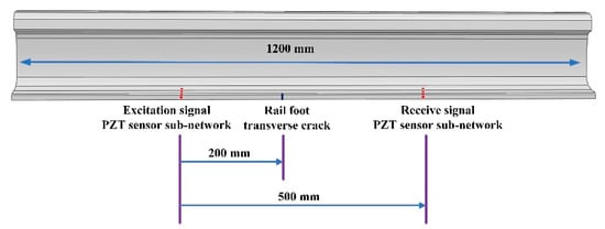 The arrangement of the piezoelectric sensor array is shown in Figure 6. The piezoelectric sensor array provides a simple and efficient method to monitor the bottom area of the rail. The array presented in this paper used a piezoelectric ceramic sheet (PZT) as the ultrasonic transducer. The specific model is PZT–5A, which has the advantages of high sensitivity and good stability [24]. It was composed of two sub-arrays, one of which was used for the excitation signal of the UGW and the other for the receiving signal of the UGW. Each sub-array was composed of four PZT–5As, where three were placed on the upper surface of the rail bottom, and one was placed on the bottom-side edge of the rail. Further, the interval between the two sub-network arrays was 500 mm. There were three PZT–5As on the upper surface of the rail bottom, which could effectively monitor various types of damage to the rail bottom. The damage mainly considered in this paper is the transverse cracks in rail bottoms.
