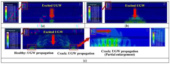 Propagation cloud diagram of UGW on rail bottom at different times; (a–c) are the propagation nephograms of ultrasonic guided waves at 15 μs, 39 μs, and 81 μs, respectively.