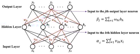 The learning process of the BPNN consists of two activities: forward propagation of the signal and backpropagation of the error. During forward propagation, the features of the sample are input from the input layer; the signal is then processed by each hidden layer and, finally, output by the output layer. Among these, the equation from the input layer to the hidden layer is Equation (10), and the equation from the hidden layer to the output layer is Equation (11).