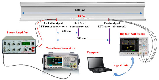 Monitoring methods can be divided into passive monitoring and active monitoring. Commonly used sensors for passive monitoring include accelerometers, strain gauges, and fibre–optic sensors. Accelerometers are often used to acquire structural global information such as modal data (frequency, mode shape, etc.). They are however insensitive to small damage which is a local phenomenon and therefore does not significantly modulate the global structural features. Strain gauges provide localised measurement, but they are good at capturing static or dynamic measurands at a relatively low variation rate only. Fibre–optic sensors measure local strain as well, but directivity and embeddability are factors that can influence the measurement accuracy to some extent [16]. UGW detection technology represents a commonly used active monitoring method. Compared with traditional ultrasonic waves, UGWs have a long propagation distance, fast propagation speed and high detection efficiency. They do not need to use train running time for the detection process and can enable all-weather online monitoring of rail–bottom cracks by being fixed on the rail for long periods of time. When UGWs encounter a crack, a reflected echo is generated, and the transmitted wave is attenuated, accompanied by a complex mode-conversion phenomenon in the process. Through the analysis and processing of the collected guided wave signals, we can judge whether the rail has cracks and other damage and can obtain specific damage information such as location and size [16]. At the beginning of the 21st century, Rose et al., [12] were the first to propose the application of UGWs for the detection of rail defects. In recent years, Xing et al., [17] proposed a defect localisation method based on the UGW single-mode algorithm to evaluate the defect location. Serafeim et al., [18] combined the UGW monitoring method with the Support Vector Machines classification method to realise the rapid detection of rail bottom damage. The excitation frequency signal of the UGWs was 100 kHz. Deng et al., [19] proposed a segmented principal component analysis method to extract the features of the signals collected by the sensors at different positions and used SVM to quickly classify the cracks, corrosion, transverse cracks and other defects on the rail head surface. Hu et al., [20] realised crack location monitoring of 14 mm at the bottom of the rail through active and passive UGWs. The aforementioned findings indicate that UGW technology has positive outcomes for rail crack monitoring. However, in the existing studies, the objects inspected using UGWs contain defects whose depths are in centimetres, and there has been little monitoring research on rail bottom transverse cracks. Therefore, it is necessary to monitor the transverse cracks at the bottom of the rail that are millimetres in depth to ensure the health of the rail and the safety of railway operations.