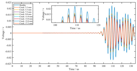 Figure 19 shows the signal waveforms of the UGW collected at different crack depths in the time range of 140 μs for the path E2–R2 in the experiment. The transverse crack depths of the rail bottom were 3.3 mm, 5.3 mm, 7.5 mm, 9.0 mm, 11.0 mm, 13.0 mm, 15.0 mm and 17.5 mm. It can be seen from Figure 18 that the monitoring signal waveforms caused by cracks at different depths of the rail bottom are roughly similar, and the signal amplitude only has a large attenuation when the crack first appears; then, with an increase in the crack depth, the signal amplitude changes very little. According to the elastic wave theory, due to the existence of a transverse crack defect on the rail bottom, the UGW will not only interact with the transverse crack on the rail but also reflect with the edge of the rail bottom. The corresponding wave packet will cause the amplitude change and the overlap of the final time domain signal. Therefore, the crack signal may be submerged, and it will become difficult to distinguish the depth of the transverse crack at the rail bottom using only the time domain waveform signal of the crack detection signal; thus, more characteristic information needs to be extracted.