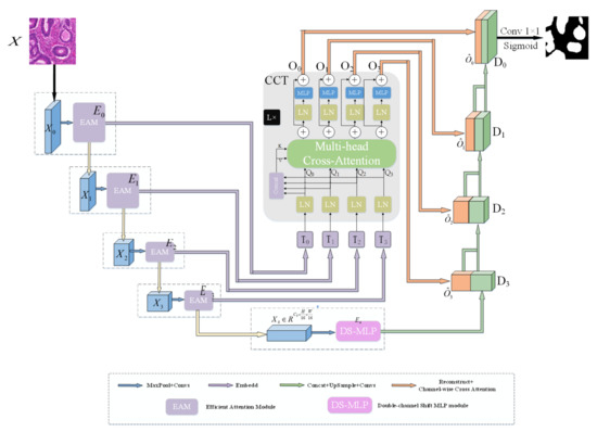 The overall architecture of the network is shown in Figure 1. The network consists of four parts: encoder, skip connection, bottleneck block, and decoder. The encoder uses EAM and convolution layers for feature extraction. As shown in Figure 1, EAM enhances the foreground and suppresses the invalid background information in medical images by performing feature refinement at the channel and spatial levels. In order to provide the decoder with more refined foreground information, DS-MLP further enhances the foreground information via the channel and spatial shift operations and embeds it into the bottleneck block. The skip connections and decoders are aligned with UCTransNet [31].