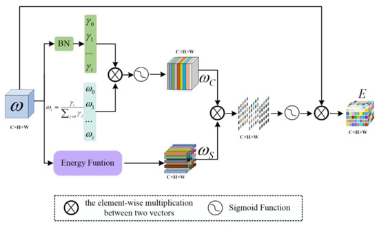 In the spatial dimension, the minimum energy function [36] within a single channel is used to estimate the weight of each neuron within the spatial dimension of the image to extract the edge information of the lesion area and nucleus. The minimum energy function [36] was proposed by Yang et al. By summarizing some of the neuroscience findings, they found that the neurons with a large amount of information can show different firing patterns from the surrounding neurons. They define an energy function for each neuron by measuring the linear separability between one target neuron and other neurons. Assuming that all of the pixels on a single channel follow the same distribution, the mean and variance of all neurons can be calculated and reused for all neurons on that channel [37]. Finally, a minimum energy function is obtained: