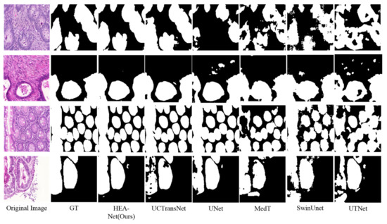 In the GlaS dataset, Dice and IoU reached 90.56% and 83.62%, respectively, obtaining the best Dice and IoU. We show the qualitative comparison results in Figure 6. It can be seen that: (1) UNet is more likely to cause over-segmentation or under-segmentation (for example, line 1, line 2, and line 4). (2) In UCTransNet, these phenomena are improved with Transformer. This shows that the Transformer-based hybrid model has strong global context modeling ability. However, due to Transformer’s weak local modeling ability, it can be seen from Swin-UNet’s forecast segmentation diagram that its segmentation contour is relatively rough. (3) Compared with other models, the segmentation effect of HEA-Net is better. Its segmentation profile is also smoother. It can accurately identify the edge of the lesion tissue (for example, the first and fourth lines).