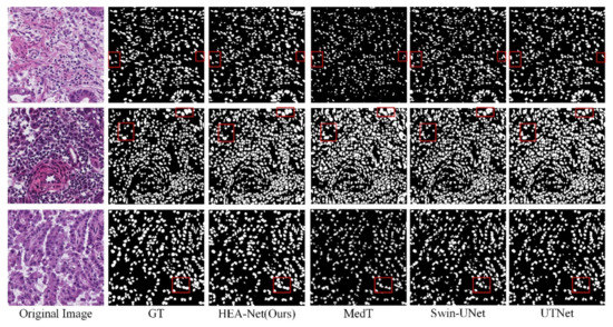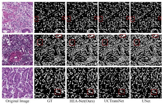In the MoNuSeg dataset, Dice and IoU reached 80.80% and 68.26%, respectively. As shown in Figure 7 and Figure 8, we offer the network segmentation results based on UNet and Transformer. It can be seen from the figure that: (1) UNet still has some cases of misclassifying background pixels as foreground pixels (for example, the first line of Figure 7). (2) The Transformer hybrid model ameliorates some of the incorrect predictions. However, Transformer’s poor sensitivity to local information is at a disadvantage for nuclear segmentation (see lines 1 and 3 in Figure 8). (3) Compared with other models, HEA-Net can capture the nucleus better.