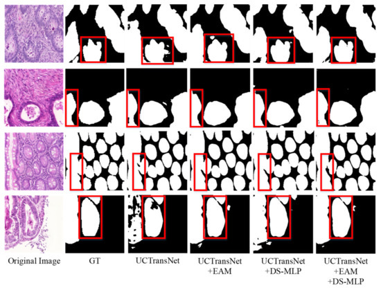 On the GlaS dataset, Dice and IoU are 1.02% and 1.36% higher than the baseline (UC-TransNet), respectively. As shown in Figure 9, our model has remarkable performance in segmenting the edges of diseased tissue. The EAM module assigns unique weights to the pixel values from the channel dimension and spatial dimension, respectively, so as to strengthen the foreground information and weaken the background information. Taking the fourth row in Figure 9 as an example, the EAM module has a more accurate and smooth processing of the boundary of the foreground part, and the segmentation of the large areas is closer to the label graph (GT). DS-MLP simply further enhances the acquired features to avoid information loss. As you can see in the fourth row of Figure 9, the results with the addition of the DS-MLP module are significantly more complete than the baseline (UCTransNet), but slightly worse than the results with the addition of the EAM module. The combination of EAM and DS-MLP can better capture the foreground information of the samples. Therefore, HEA-Net has a solid ability to segment highly similar foreground and background information.
