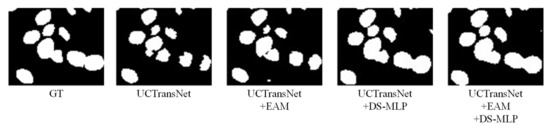 On the MoNuSeg dataset, Dice and IoU are 1.29% and 2.11% higher than the baseline (UCTransNet), respectively. As shown in Figure 10, most of the nucleus boundaries are closely connected, which increases the segmentation difficulty of our model. As can be seen from Figure 10, although the segmentation result of our model is improved compared to the baseline (UCTransNet), it is not very complete compared to the label map. From the fourth row in Figure 10, we derive a set of local enlargements (Figure 11). As shown in Figure 11, the segmentation graph with the DS-MLP module is more complete than that with the EAM module. This is because the DS-MLP module obtains salient features through hierarchical operation, which is better able to avoid the loss of important information. In order to correctly identify the boundary information of the nucleus, the network needs to pay more attention to the extraction of local details. The combination of EAM and DS-MLP can more accurately grasp the nuclear boundary information for local modeling. Thus, the HEA-Net segmentation of the nucleus is complete.