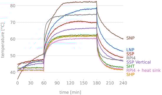 The temperature of a RPi 4B without any type of heat sink (i.e., naked device) has been taken as a reference (see Figure 3a).