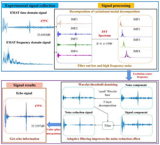 Firstly, the method and principle of this paper are introduced. On this basis, an experimental system is designed to acquire electromagnetic ultrasonic signals at different temperatures. Finally, in order to verify the feasibility and effectiveness of the proposed method, the noise reduction effects of VMD, WTD, EMD, and AFIV on EMAT signals at different temperatures are compared and discussed.