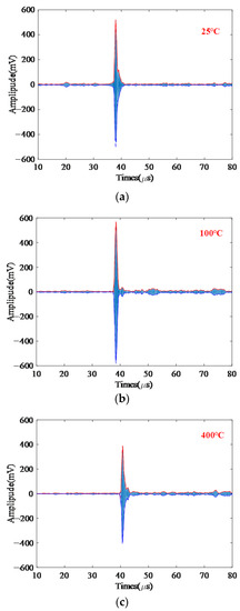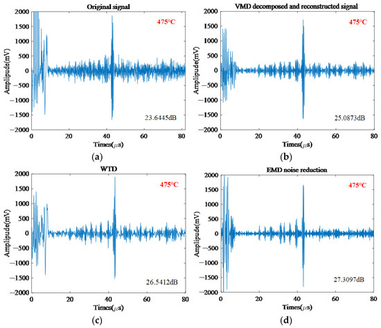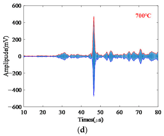 To verify the applicability of the denoising method proposed in this paper, ultrasonic detection was carried out on Cr25Mo3Ti and 12CrMo materials in the range of 25 to 700 °C. During the experiment, it must be noted that all samples were heated from the furnace bottom, and temperature measurements were made on the surface of each sample. As shown in Figure 9, the electromagnetic ultrasonic signals measured at intervals of 50 °C were selected and processed by different denoising methods, which verified that the denoising method proposed in this paper is suitable for the selected temperature range, and the SNR greatly improved.
