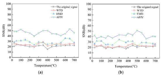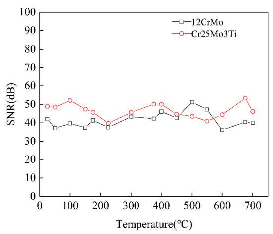 The EMAT signals of Cr25Mo3Ti and 12CrMo from 25 to 700 °C were denoised by the AFIV denoising method. The SNR result of the denoising signal is shown in Figure 8. It can be seen that the denoising effect of AFIV method is not affected by temperature and basically keeps within a stable range. The effectiveness of AFIV noise reduction method is verified.