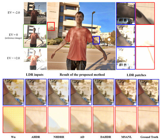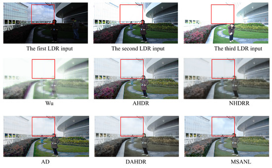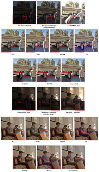Table 1 shows the average value of the quantitative indicators, and the larger values correspond to the higher quality. The proposed model achieved higher values than other models in all three quantitative performance indicators. The proposed method achieved better performance in terms of PSNR-l, PSNR-, and SSIM measurements compared to AHDR [26], Wu [28], AD [27], NHDRR [30], and DAHDR [39]. This occurred because the proposed method can restore details and effectively eliminate ghosting artifacts through non-local means-based fusion modules. NHDRR [30] also merges images using non-local means modules, but MSANLnet, which extracts features using scale-specific spatial attention, exhibited numerically better performance.