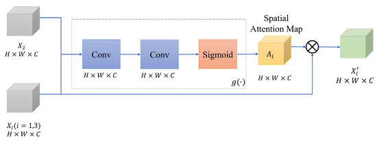 where s denotes the number of spatial scales and is the spatial attention map extractor. The attention map extractor consists of two consecutive convolutions and sigmoid function, as used in a previous study [26]. Note that, in our experiment, we used N=2 (i.e., two scales as depicted in Figure 2). An element of the spatial attention map is in a range of and the spatial size of the generated is equal to .
