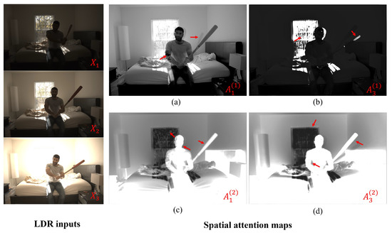 As seen in Figure 4, two spatial attention maps focus on important regions for implicit alignment of the input LDR images to the reference image. As the network is provided with explicit multi-scale contextual information, it can compensate for large foreground motions and can effectively mitigate the ghosting artifacts. Moreover, as the spatial attention maps represent the differences among the LDR images with varying exposures, the network implicitly learns to recover saturated pixel values.