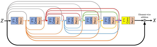 First, we utilize the residual dense convolutional block [87] before applying the non-local block, such that the feature recovered to the original size through the decoding process learns sufficient local information. By concatenating all layers, useful local information is adaptively extracted through the features of the previous layer and the features of the current layer. The extracted X enters a non-local block input and outputs Y of the same size, , as a result. Figure 5 illustrates the structure of a residual dense convolutional block composed of three convolutional blocks.