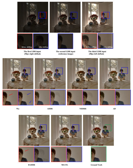 We have performed additional experiments with the translation applied to the input LDR images and visually compared the HDR restoration performance between the proposed and existing methods. Specifically, we globally shifted the first input LDR image to the right by 50 pixels, kept the reference LDR image (i.e., the second image) unchanged, and shifted the third input LDR image to the left by 50 pixels, to simulate the global translation operation. The visual results are summarized in Figure 10.
