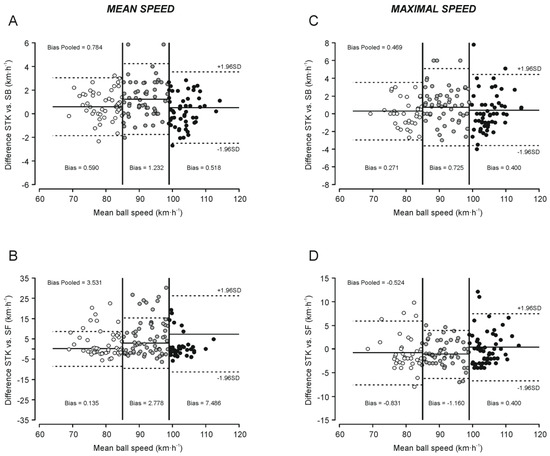 Bland–Altman plots for mean (A,B) and maximal (C,D) speed agreement analysis of the different devices used for measuring kicking ball speed. Figures show the Bland–Altman analysis for pooled data and for data divided by speed ranges. See text for details. STK: Stalker ATS II, Acceleration Testing System®; SB: Supido-back; SF: Supido-front.