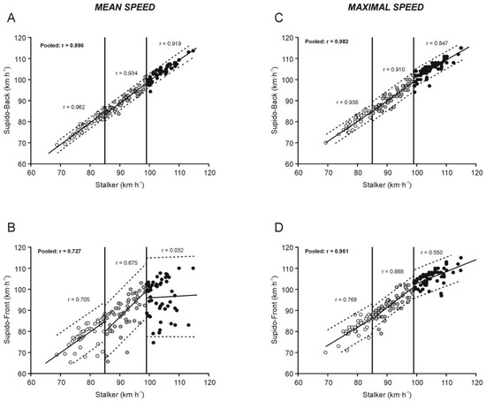 Correlation coefficient values between the different instruments are displayed in Figure 2. For the average values, an almost perfect correlation coefficient was observed between Stalker and Supido-back (r = 0.99, SEE = 1.48 km·h−1; Figure 2A), whereas the magnitude of the correlation coefficient between Stalker and Supido-front was moderate (r = 0.73, SEE = 7.13 km·h−1; Figure 2B). A very strong relationship was found for the maximum values between Stalker and Supido-back (r = 0.98, SEE = 1.99 km·h−1; Figure 2A) and Stalker and Supido-front (r = 0.95, SEE = 3.22 km·h−1; Figure 2B). When the data were analyzed by ball speed ranges, the correlation coefficient values between Stalker and Supido-front showed a progressively substantial decrease as the ball speed range increased for both the average and the maximal ball speed variables (Figure 2B,D). The relationship between Stalker and Supido-back also progressively decreased with the increasing of the speed range, but correlation coefficient values were always higher than 0.85 (Figure 2A,C).