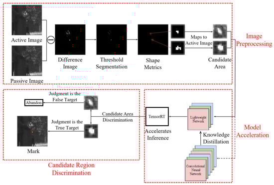 The developed algorithm flowchart is illustrated in Figure 3. Specifically, the acquired active and passive images undergo differential processing and thus are converted to differential images. In the latter images, the proposed adaptive threshold segmentation method is applied based on the statistical characteristics of the echo light intensity of the photoelectric target within the differential image. Using the above method and the shape measurement criterion of the photoelectric target, the target within the suspected target area is judged by the validity, and the screened target area was mapped to the active image as a candidate region for retention. The candidate region in the active image is input to the convolutional neural network for discrimination to obtain accurate photoelectric target information. Finally, the discriminant result is marked as the true target on the active image. However, utilizing convolutional neural networks directly on embedded devices is not processing-efficient, as it does not meet the real-time requirements for hardware platform deployment. Therefore, the network model must be accelerated, which is accomplished by developing a lightweight network after applying knowledge distillation and TensorRT technology. This strategy accelerates the inference on the lightweight network and affords its deployment on the hardware platform while meeting the real-time detection requirements.