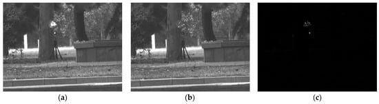 where is the largest pixel value point in the image, is a constant, represents the maximum gray value in the image, and is the difference degree of the background of the high-intensity region. When is small, the high-intensity area has fewer false targets, and can be approximated as the difference degree between the photoelectric target and the background of the high-intensity area. The greater the difference degree between the photoelectric target and the high-intensity background while solving for the threshold , the higher the weight of , and the more that the threshold tends to be the maximum gray value. The comparison after threshold segmentation is presented in Figure 6c.