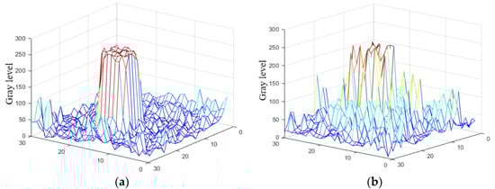 The real target represented in Figure 5a has a single peak identified with a smooth mountain peak straight up and down the mountain. The detector’s light saturation causes the smoothness of its summit. Opposing, the pseudo-target in Figure 5b has a continuous multi-peak feature. The area around the peak fluctuates more violently than the true target due to the changing pixel values between the pseudo-target and the surrounding pixels affected by diffuse reflection. These two characteristics are used to judge a potential target.